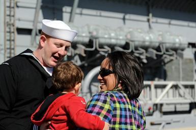| Keywords: US Navy 111101-N-XR557-179 A Sailor assigned to the guided-missile cruiser USS Monterey (CG 61) greets his family upon returning from an eight-mont.jpg en NORFOLK Nov 1 2011 A Sailor assigned to the guided-missile cruiser USS Monterey CG 61 greets his family upon returning from an eight-month deployment to the Mediterranean Sea Monterey visited 16 ports as the initial platform for the ballistic missile defense of Europe U S Navy photo by Mass Communication Specialist 2nd Class Katerine Noll/Released 2011-11-01 111101-N-XR557-179 Navy http //www navy mil/view_image asp id 109764 U S Navy photo by Mass Communication Specialist 2nd Class Katerine Noll PD-USGov-Military-Navy Aboard USS Monterey CG-61 |