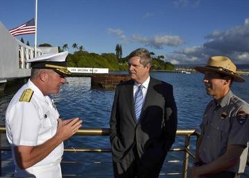 | Keywords: US Navy 120110-N-RI884-077 Secretary of Agriculture Tom Vilsack, center, visits the USS Arizona Memorial with Rear Adm. Glenn Robillard, left, and.jpg en PEARL HARBOR Jan 10 2012 Secretary of Agriculture Tom Vilsack center visits the USS Arizona Memorial with Rear Adm Glenn Robillard left and National Park Service Superintendent Paul DePrey Vilsack was in Hawaii to highlight renewable energy such as the Navy's use of biodiesel to fuel the Arizona Memorial tour boats U S Navy photo by Mass Communication Specialist 2nd Class Daniel Barker/Released 2012-01-10 120110-N-RI884-077 Navy http //www navy mil/view_image asp id 113264 U S Navy photo by Mass Communication Specialist 2nd Class Daniel Barker PD-USGov-Military-Navy 2012 in Hawaii |