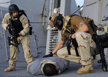 | Keywords: US Navy 120114-N-VH839-086 Senior Chief Damage Controlman Jared Klink and a U.S. Coast Guardsman apprehend a suspected pirate aboard the Arleigh Bu.jpg en RED SEA Jan 14 2012 Senior Chief Damage Controlman Jared Klink and a U S Coast Guardsman apprehend a suspected pirate aboard the Arleigh Burke-class guided-missile destroyer USS Dewey DDG 105 during a visit board search and seizure joint training exercise Dewey is deployed to the U S 5th Fleet area of responsibility conducting maritime security operations U S Navy photo by Mass Communication Specialist 3rd Class Joshua Keim/Released 2012-01-14 120114-N-VH839-086 Navy http //www navy mil/view_image asp id 113792 U S Navy photo by Mass Communication Specialist 3rd Class Joshua Keim PD-USGov-Military-Navy USS Dewey DDG-105 |