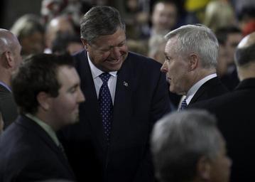 | Keywords: US Navy 120126-N-AC887-001 Secretary of the Navy (SECNAV) the Honorable Ray Mabus, right, shares a laugh with Secretary of the Air Force Michael D.jpg en AURORA Col Jan 26 2012 Secretary of the Navy SECNAV the Honorable Ray Mabus right shares a laugh with Secretary of the Air Force Michael Donley at Buckley Air Force Base Mabus and Donley were on hand to hear President Barack Obama deliver remarks on the administration's energy initiatives including the Department of the Navy's plan to obtain one gigawatt of power from renewable sources U S Navy photo by Chief Mass Communication Specialist Sam Shavers/Released 2012-01-26 120126-N-AC887-001 Navy http //www navy mil/view_image asp id 114163 U S Navy photo by Chief Mass Communication Specialist Sam Shavers PD-USGov-Military-Navy Buckley Air Force Base Michael B Donley Ray Mabus |
