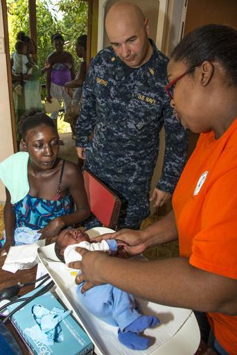 Keywords: US Navy medical professionals work with Belizean medical professionals during Southern Partnership Station '14 140701-N-IP743-121.jpg en Lt Cmdr Tim Whiting a public health nurse assigned to Naval Medical Center Portsmouth observes as Rural Health Nurse Susan Rivero weighs a baby during a mobile clinic stop in a rural Belizean village Whiting is in Belize working with his counterparts as part of Southern Partnership Station 2014 Southern Partnership Station 2014 is a U S Navy deployment focused on subject matter expert exchanges with partner nation militaries and security forces in Central and South America and the Caribbean U S military teams work with partner nation forces during naval-focused training exercises military-to-military engagements and community relations projects in an effort to enhance partnerships with regional maritime activities and improve the operational readiness of participants U S Navy photo by Mass Communication Specialist 1st Class Brett Cote/Released 2014-07-01 Petty Officer 1st Class Brett Cote https //www dvidshub net/image/1432614 140701-N-IP743-121 2014-07-02 19 36 GALES POINT BZ PD-USGov-Military-Navy Southern Partnership Station 2014 Images from DoD uploaded by Fæ |