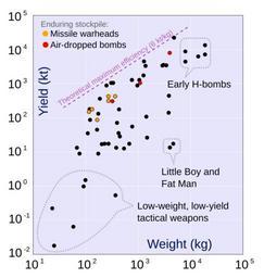 Keywords: US nuclear weapons yield-to-weight comparison.svg created with Inkscape en Logarithmic scatterplot comparing the yield in kilotons and weight in kilograms of all nuclear weapons developed by the United States 1945-1993 Weapons variable yield and weight have been plotted at their highest yield and weight Also indicated on the graph are a few characteristics of the weapons Little Boy and Fat Man the early H-bombs small tactical weapons and weapons in the enduring stockpile separated by missile warheads and air-dropped bombs <br />Processed first in Microsoft Excel and then re-plotted in Inkscape by User Fastfission Data itself retrieved from http //nuclearweaponarchive org/Usa/Weapons/Allbombs html Fastfission 2006-08-12 If you want to credit someone credit Wikimedia Commons Otherwise don't credit anyone that's fine by me --Fastfission 15 03 14 April 2008 UTC International version French version Fastfission Nuclear weapons data Scatterplots |