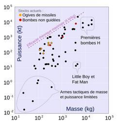 Keywords: US nuclear weapons yield-to-weight comparison-fr.svg created with Inkscape en Logarithmic scatterplot comparing the yield in kilotons and weight in kilograms of all nuclear weapons developed by the United States 1945-1993 Weapons variable yield and weight have been plotted at their highest yield and weight Also indicated on the graph are a few characteristics of the weapons Little Boy and Fat Man the early H-bombs small tactical weapons and weapons in the enduring stockpile separated by missile warheads and air-dropped bombs <br />Processed first in Microsoft Excel and then re-plotted in Inkscape by User Fastfission fr Graphique logarithmique de la puissance explosive en kilotonnes en fonction de la masse en kilogrammes de toutes les armes nucléaires fabriquées par les États-Unis de 1945 à 1993 Pour les ogives à puissance explosive variable la puissance et la masse ont été tracés à leur valeur maximale Également le graphique donne quelques informations supplémentaires Little Boy et Fat Man les premières bombes H les armes tactiques et les armes faisant partie du enduring stockpile lesquels sont ciblées selon qu'elles sont des ogives ou des bombes larguées depuis les airs <br />Données traitées à l'aide de Microsoft Excel puis redessinées à l'aide de Inkscape par User Fastfission ;Légende Titre Arsenal nucléaire des États-Unis de 1945 à 1993 Puissance explosive en fonction de la masse d'explosif nucléaire Axe vertical Puissance explosive en kt Axe horizontal masse d'explosif nucléaire en kg 1 Efficacité théorique maximale 6 kt/kg <span style background-color FFA400 > </span> Ogives nucléaires du Enduring Stockpile <span style background-color FF0000 > </span> Bombes nucléaires du Enduring Stockpile larguées depuis les airs A Premières bombes H B Little Boy et Fat Man C Armes nucléaires tactiques de faibles puissances et de faibles masses Data itself retrieved from http //nuclearweaponarchive org/Usa/Weapons/Allbombs html Fastfission 2006-08-12 If you want to credit someone credit Wikimedia Commons Otherwise don't credit anyone that's fine by me --Fastfission 15 03 14 April 2008 UTC Original version International version Fastfission Nuclear weapons data Scatterplots |