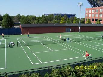 Keywords: Us open practice court.JPG U S Open Practice Courts With New York Mets Shea Stadium In Blue In The Background Own 2004-08-24 Me Alexisrael USTA National Tennis Center Photographs by Alexisrael