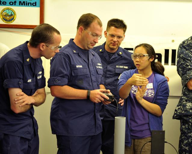 | Keywords: US Pacific Fleet and Office of Naval Research sponsor robotics competition, RIMPAC 2014 140705-N-UG232-003.jpg en Jennifer Loui a junior from Pearl City High School instructs Electronics Technician 3rd Class Thomson Butcher stationed onboard the USCGC Waesche WMSL 75 in operating the Pearl City team's entry in the robotics competition The competition sponsored by the U S Pacific Fleet and the Office of Naval Research gave students a chance to meet Rim of the Pacific RIMPAC Exercise 2014 participants and learn about the Navy while building skill proficiencies in Science Technology Engineering and Math STEM The world's largest international maritime exercise RIMPAC provides a unique training opportunity that helps participants foster and sustain the cooperative relationships that are critical to ensuring the safety of sea lanes and security on the world's oceans Twenty-two nations more than 49 ships six submarines more than 200 aircraft and 25 000 personnel are participating in RIMPAC U S Navy photo by Mass Communication Specialist 1st Class Martin Wright/Released 2014-07-05 Petty Officer 1st Class Martin Wright https //www dvidshub net/image/1439582 140705-N-UG232-003 2014-07-09 05 15 JOINT BASE PEARL HARBOR-HICKAM HI US PD-USGov-Military-Navy People at Joint Base Pearl Harbor-Hickam RIMPAC 2014 Office of Naval Research Images from DoD uploaded by Fæ |