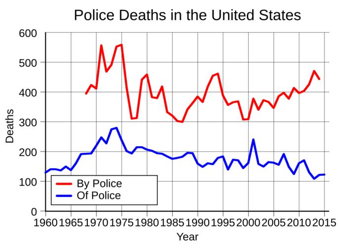 Keywords: US police deaths.svg en Police deaths in the United States and by the police from FBI UCR table 14 http //www fbi gov/about-us/cjis/ucr/crime-in-the-u s/2012/crime-in-the-u s -2012/offenses-known-to-law-enforcement/expanded-offense/expandedoffensemainhttps //www fbi gov/about-us/cjis/ucr/crime-in-the-u s/2013/crime-in-the-u s -2013/offenses-known-to-law-enforcement/expanded-offense/expandedoffensemain_finalhttps //www fbi gov/about-us/cjis/ucr/crime-in-the-u s/2014/crime-in-the-u s -2014/offenses-known-to-law-enforcement/expanded-offense 1976-1998 datahttp //www prisonpolicy org/scans/bjs/ph98 pdf andhttp //dailykenn com/522 pdf 1968-1975 datahttp //www bjs gov/content/pub/ascii/ph98 txt and http //www nleomf org/facts/officer-fatalities-data/year html National Law Enforcement Officers Memorial Fund Note - the deaths by police is at least two or three times what is reported by the FBI as they do not receive data from many departments 2015 had a reported http //www killedbypolice net/kbp2015 html 1208 deaths 2016-07-07 own Delphi234 other versions Generated with Wikimedia SVG Chart SVG Chart/box cc-zero Homicide statistics Police of the United States |