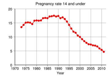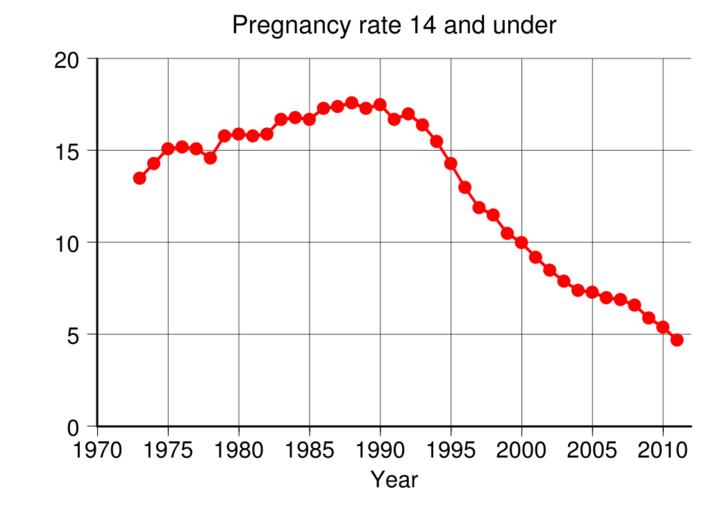 MAKE A MEME View Large Image Pregnancy Rate 14 and Under.svg translate yes en Pregnancy rate per 1000 14 and under in the United States Data from http //www guttmacher org/pubs/USTPtrends10 pdf Table 2 4 pg 13 2015-01-23 own Delphi234 other versions Generated with ...