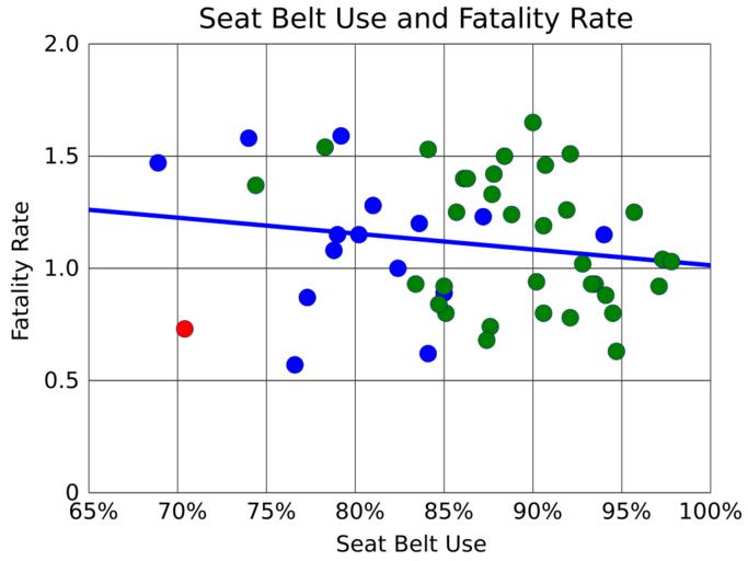 Keywords: US seat belt use and fatality rate.svg translate yes en There is a small but significant correlation between seat belt use and fatality rate despite survivability in an automobile accident being reduced by three to four times by not wearing a seat belt The data shows that avoiding an accident is the best way to prevent highway fatalities Massachusetts has the lowest fatality rate but has the fifth lowest rate of seat belt use Average seat belt use is 87 and instead of 13 of fatalities being unsecured was 49 of fatalities The SVG shows the state name if the mouse is held over the data point Fatality rate is per 100 million vehicle miles Red states New Hampshire have no seat belt law for adults blue have a secondary enforcement law and green a primary enforcement law Data is for 2014 from US NHTSAhttp //www-nrd nhtsa dot gov/departments/nrd-30/ncsa/STSI/USA 20WEB 20REPORT HTMhttp //www-nrd nhtsa dot gov/Pubs/812149 pdf 2016-06-09 own Delphi234 other versions cc-zero Seat belts Road transport safety in the United States