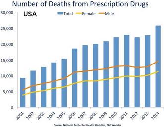 Keywords: US timeline. Prescription drug overdose deaths.jpg graph en National Overdose Deaths ”Number of Deaths from Prescription Drugs The figure above is a bar chart showing the total number of U S overdose deaths involving prescription drugs from 2001 to 2014 The chart is overlayed by a line graph showing the number of deaths by females and males From 2001 to 2014 there was a 2 8-fold increase in the total number of deaths 2016-01-18 - date of original upload here of adapted chart https //d14rmgtrwzf5a cloudfront net/sites/default/files/cdc-us-overdose-deaths-2014_jr-1 jpg Chart from http //www drugabuse gov/related-topics/trends-statistics/overdose-death-rates Overdose Death Rates By National Institute on Drug Abuse NIDA National Institute on Drug Abuse And User Timeshifter I Timeshifter cropped the original chart and added USA to it I put the adapted chart under the same public domain license See Commons Convert tables and charts to wiki code or image files and the section about adding text to chart images other versions PD-USGov Drug-related death statistics |