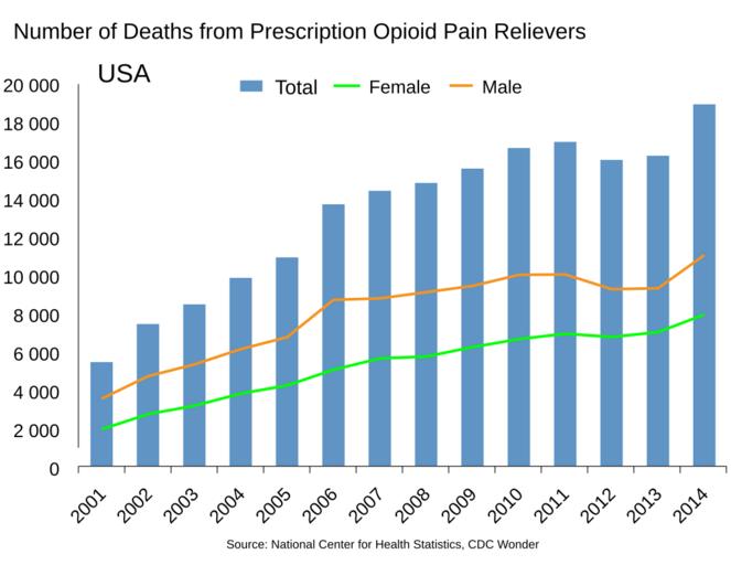 | Keywords: US timeline. Prescription opioid pain reliever deaths.svg en National Overdose Deaths ”Number of Deaths from Prescription Opioid Pain Relievers The figure above is a bar chart showing the total number of U S overdose deaths involving opioid pain relievers from 2001 to 2014 The chart is overlayed by a line graph showing the number of deaths by females and males From 2001 to 2014 there was a 3 4-fold increase in the total number of deaths 2016-12-26 - date SVG file created and uploaded based on File US timeline Prescription opioid pain reliever deaths jpg which is based on https //d14rmgtrwzf5a cloudfront net/sites/default/files/cdc-us-overdose-deaths-2014_jr-2 jpg Chart from http //www drugabuse gov/related-topics/trends-statistics/overdose-death-rates Overdose Death Rates By National Institute on Drug Abuse NIDA I created this SVG file based on the following and changed the yellow line to green because the RGB yellow did not provide much contrast against a white background Original by National Institute on Drug Abuse And User Timeshifter who cropped the original chart and added USA to it put the adapted chart under the same public domain license See Commons Convert tables and charts to wiki code or image files and the section about adding text to chart images other versions PD-USGov Drug-related death statistics |
