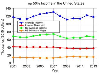| Keywords: US Top 50 Percent Income.svg translate yes en US Top 50 average income and income threshold from 2001 to 2013 in constant 2015 dollars with US average income and US minimum wage 40 hour work week Data is from https //www irs gov/pub/irs-soi/13in01etr xls US IRS 2015-06-06 own Delphi234 other versions For data see File US Top 0 001 Percent Income svg Generated with Wikimedia SVG Chart SVG Chart/box current annually cc-zero Income distribution in the United States | ||||