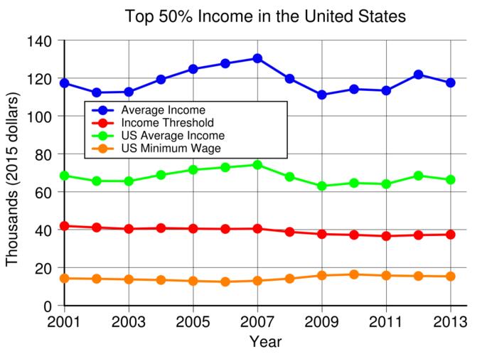 Keywords: US Top 50 Percent Income.svg translate yes en US Top 50 average income and income threshold from 2001 to 2013 in constant 2015 dollars with US average income and US minimum wage 40 hour work week Data is from https //www irs gov/pub/irs-soi/13in01etr xls US IRS 2015-06-06 own Delphi234 other versions For data see File US Top 0 001 Percent Income svg Generated with Wikimedia SVG Chart SVG Chart/box current annually cc-zero Income distribution in the United States |