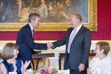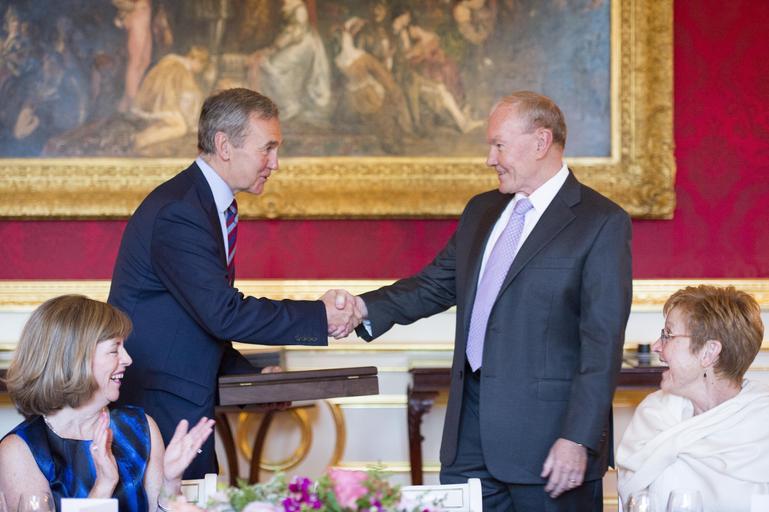 Keywords: US, UK Joint Chiefs of Staff talk collaboration 140610-D-KC128-734.jpg en Chairman of the Joint Chiefs of Staff U S Army Gen Martin E Dempsey standing right shakes hands with Chief of the Defense Staff British army Gen Sir Nicholas Houghton after giving a gift during a dinner in honor of the U S Joint Chiefs of Staff concluding a defense chiefs strategic dialogue with the U S Joint Chiefs of Staff and their British counterparts June 10 2014 in London DoD photo by Mass Communication Specialist 1st Class Daniel Hinton U S Navy/Released 2014-06-10 Petty Officer 1st Class Daniel Hinton https //www dvidshub net/image/1399237 140610-D-KC128-734 2014-06-14 18 01 LONDON GTL GB PD-USGov Nicholas Houghton Martin E Dempsey in 2014 Images from DoD uploaded by Fæ |