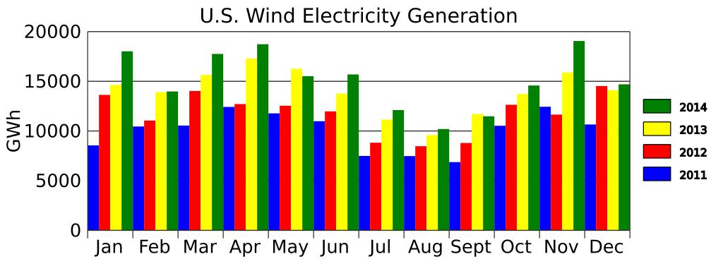 Keywords: US Wind Generation-2014.svg translate yes en U S wind generation in 2014 in GWh from http //www eia gov/electricity/monthly/index cfm Electric Power Monthly Table 1 1 A 2015-05-14 own Delphi234 other versions cc-zero Uploaded with UploadWizard Wind energy statistics of the United States |