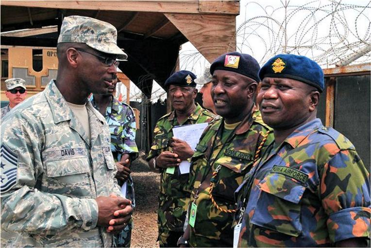 Keywords: USAFE - Senior Enlisted Leadership in Action.jpg en CAMP LEMONNIER Djibouti March 27 2012 - Combined Joint Task Force - Horn of Africa Command Senior Enlisted Leader U S Air Force Chief Master Sgt James E Davis Kenya Air Force Base Sgt Major Maurice Atsango Matwang'a right and Kenya Army Weapons Training Sgt Major David Karisa Barisa discuss a personnel inspection they just completed here March 27 during a visit with Task Force Raptor soldiers from U S Army 3rd Squadron 124th Cavalry Regiment Texas Army National Guard CJTF-HOA hosted the four Kenyan Ministry of Defense senior enlisted leaders to exchange best practices and enhance understanding of the enlisted leadership roles and responsibilities that affect mission execution U S Navy photo by Mass Communication Senior Chief Petty Officer Maria R Escamilla http //www africom mil/Newsroom/Article/8887/kenyan-us-senior-enlisted-leadership-in-action United States Navy 2012-03-27 USGOV-PD PD-USGov-Military-Navy 2012 photographs 27 March Airman Battle Uniform March 2012 in Africa Military units and formations of the United States Air Force People of the United States in 2012 Texas National Guard Texas Army National Guard Air force of Kenya 124th Cavalry Regiment United States |