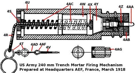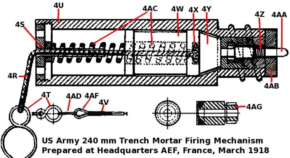 Keywords: USArmy240mmTrenchMortarDetailedFiringMechanismMarch1918.jpg See Also 240 mm 9 45 inch Mortar Breech Mechanism December 1917 240 mm 9 45 inch Trench Mortar Cartridge Case diagram March 1918 240 mm Trench Mortar <table style text-align left; width 100 ; border 1 cellpadding 2 cellspacing 2 > <tr align center > <td colspan 5 rowspan 1 style vertical-align top; ><span style font-weight bold; >240 mm Trench Mortar Detailed Firing Mechanism</span> </td> </tr> <tr> <td style vertical-align top; font-weight bold; >Symbol</td> <td style vertical-align top; font-weight bold; >Quan-<br>tity</td> <td style vertical-align top; font-weight bold; >Name of part</td> <td style vertical-align top; font-weight bold; >Material</td> <td style vertical-align top; font-weight bold; >Location and purpose</td> </tr> <tr> <td style vertical-align top; >4R</td> <td style vertical-align top; >1</td> <td style vertical-align top; >Lanyard cord</td> <td style vertical-align top; >Braided sash cord</td> <td style vertical-align top; >6 inch long Through plug 4S and plunger 4W Means of pulling back plunger</td> </tr> <tr> <td style vertical-align top; >4S</td> <td style vertical-align top; >1</td> <td style vertical-align top; >Plug</td> <td style vertical-align top; >Forged steel</td> <td style vertical-align top; >Screws into end of housing 4U Cover for firing mechanism</td> </tr> <tr> <td style vertical-align top; >4T</td> <td style vertical-align top; >1</td> <td style vertical-align top; >Lanyard eye</td> <td style vertical-align top; >Spring-steel wire</td> <td style vertical-align top; >Attached to end of lanyard cord 4R </td> </tr> <tr> <td style vertical-align top; >4U</td> <td style vertical-align top; >1</td> <td style vertical-align top; >Housing</td> <td style vertical-align top; >Forged steel</td> <td style vertical-align top; >Screws into hole in breech slide 4C Contains firing mechanism</td> </tr> <tr> <td style vertical-align top; >4V</td> <td style vertical-align top; >1</td> <td style vertical-align top; >Lanyard</td> <td style vertical-align top; >Braided sash cord</td> <td style vertical-align top; >Attached to lanyard hook 4AD Operates firing mechanism</td> </tr> <tr> <td style vertical-align top; >4W</td> <td style vertical-align top; >1</td> <td style vertical-align top; >Plunger</td> <td style vertical-align top; >Forged steel</td> <td style vertical-align top; >Fits inside housing 4U Delivers blow to anvil 4Y </td> </tr> <tr> <td style vertical-align top; >4X</td> <td style vertical-align top; >1</td> <td style vertical-align top; >Lanyard washer</td> <td style vertical-align top; >Steel</td> <td style vertical-align top; >Fits over end of lanyard cord 4R preventing it from pulling through the plunger 4W </td> </tr> <tr> <td style vertical-align top; >4Y</td> <td style vertical-align top; >1</td> <td style vertical-align top; >Anvil</td> <td style vertical-align top; >Tool steel</td> <td style vertical-align top; >Fits inside housing 4U Drives striker 4AA </td> </tr> <tr> <td style vertical-align top; >4Z</td> <td style vertical-align top; >1</td> <td style vertical-align top; >Striker spring</td> <td style vertical-align top; >Spring-steel wire</td> <td style vertical-align top; >Fits inside housing 4U Returns striker 4AA to position</td> </tr> <tr> <td style vertical-align top; >4AA</td> <td style vertical-align top; >1</td> <td style vertical-align top; >Striker</td> <td style vertical-align top; >Tool steel</td> <td style vertical-align top; >Fits inside housing 4U Strikes percussion cap of cartridge</td> </tr> <tr> <td style vertical-align top; >4AB</td> <td style vertical-align top; >1</td> <td style vertical-align top; >Vent bushing</td> <td style vertical-align top; >Forged steel</td> <td style vertical-align top; >Screws into end of housing 4U </td> </tr> <tr> <td style vertical-align top; >4AC</td> <td style vertical-align top; >1</td> <td style vertical-align top; >Plunger spring</td> <td style vertical-align top; >Spring-steel wire</td> <td style vertical-align top; >Fits inside plunger 4W and over plug 4S Drives plunger</td> </tr> <tr> <td style vertical-align top; >4AD</td> <td style vertical-align top; >1</td> <td style vertical-align top; >Lanyard hook</td> <td style vertical-align top; >Steel</td> <td style vertical-align top; >Catches in lanyard eye 4T attaching lanyard 4V </td> </tr> <tr> <td style vertical-align top; >4AF</td> <td style vertical-align top; >1</td> <td style vertical-align top; >Rope thimble</td> <td style vertical-align top; >Steel</td> <td style vertical-align top; >Fits into lanyard hook 4AD Protects lanyard 4V </td> </tr> <tr> <td style vertical-align top; >4AG</td> <td style vertical-align top; >1</td> <td style vertical-align top; >Sight plug</td> <td style vertical-align top; >Steel</td> <td style vertical-align top; >A hollow cylinder 2 795 inch long x 1 75 inch at large end 1 417 inch at small end Fits into breech slide 4C when aligning sight</td> </tr> </table> Detailed Cross-sectional view of firing mechanism for the 240 mm Trench Mortar as adopted by the US Army March 1918 Based on Figure 2 in Manual for Trench Artillery United States Army Part IV 240 mm Trench Mortar <br>Prepared at Headquarters American Expeditionary Force France March 1918 <br>Reprint July 1918 <br>War Department Document No 820 A E F No 519 Office of the Adjutant General <br>http //cgsc cdmhost com/u /p4013coll9 252 2007-09-11 Rcbutcher PD-USGov 240 mm Trench Mortar 1910s technical drawings |