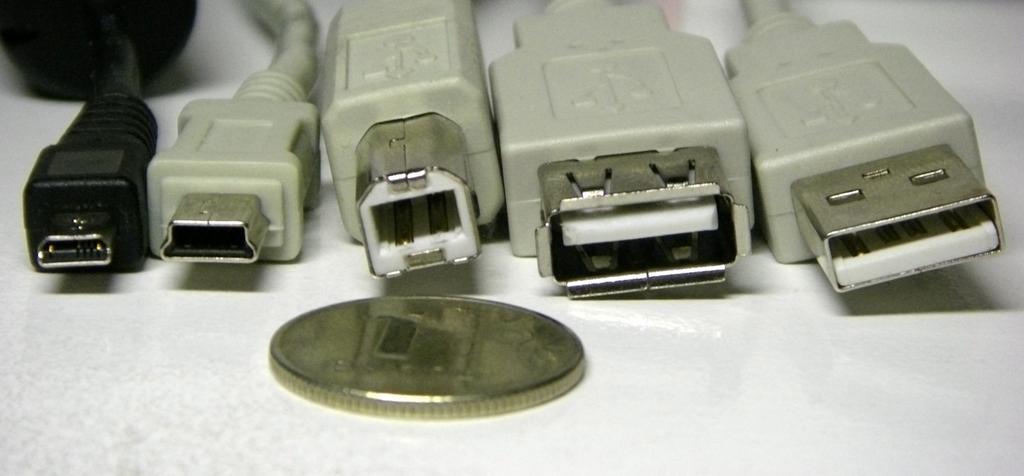 Keywords: USB types.jpg Types of USB connectors from left to right male Mini USB 8-pin B-Type mini USB B-type A-type mother A-type with a one-ruble coin 20 5 mm diameter in front for comparison own 15 10 5 June 2007 UTC George Shuklin USB connectors