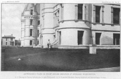 Keywords: USGS Idaho Montana 1900 Survey Spokane Courthouse Astronomic Piers.jpg en These stone monuments also known as astronomic piers next to the Spokane Courthouse cupola flagpole were used as base stations or benchmark reference points for latitude and longitude in the USGS Survey of the Boundary Line Between Idaho and Montana from the International Boundary to the Crest of the Bitterroot Mountains Surveyed in 1897-1898 USGS Idaho Montana 1900 Survey Spokane Courthouse Astronomic Piers United States Coast and Geodetic Survey 1888 Astronomic Longitude Pier United States Geological Survey 1896 Astronomic Latitude Pier Stone Masonry Survey Monuments Photo captions U S Geological Survey BULLETIN NO 170 PL IV ASTRONOMIC PIERS IN COURT-HOUSE GROUNDS AT SPOKANE WASHINGTON U S Geological Survey latitude pier in right foreground; U S Coast and Geodetic Survey longitude pier behind figure of man 1900-2-21 12 00 00 United States Government Printing Office United States Geological Survey No 170 Department of the Interior 47 664590 -117 428369 Photo captions U S Geological Survey BULLETIN NO 170 PL IV ASTRONOMIC PIERS IN COURT-HOUSE GROUNDS AT SPOKANE WASHINGTON U S Geological Survey latitude pier in right foreground; U S Coast and Geodetic Survey longitude pier behind figure of man Historic background These stone monuments also known as astronomic piers next to the Spokane Courthouse cupola flagpole were used as base stations or benchmark reference points for latitude and longitude in the USGS Survey of the Boundary Line Between Idaho and Montana from the International Boundary to the Crest of the Bitterroot Mountains Surveyed in 1897-1898 Bulletin of the United States Geological Survey No 170 Department of the Interior Printed in 1900 by US Government Printing Office Photographic and Drawn Plates images of the field work of the survey The Idaho-Montana boundary used Stone Survey Monuments and Iron Post Survey Monuments Placed into the Public Domain by government of USA Printed more than 114 years prior to time of upload excerpt from the USGS printed survey report 1900 Survey Report This point is connected by direct measurement with longitude pier of the United States Coast and Geodetic Survey of 1888 and with latitude pier of the United States Geological Survey of 1896 It is also connected by triangulation with the stations of the base expansion The point located is the center of the flagstaff which is over the center of the cupola of the new court-house USGS Idaho Montana Boundary 1897 Survey Control Diagram of Triangulation from Spokane Courthouse Astronomic Piers framed right USGS Idaho Montana Boundary 1897 Survey Control Diagram of Triangulation from Spokane Courthouse Astronomic Piers PD-USGov Courthouses in Washington state United States Coast and Geodetic Survey United States Geological Survey markers Surveying in the United States Wikipedia Summer of Monuments |