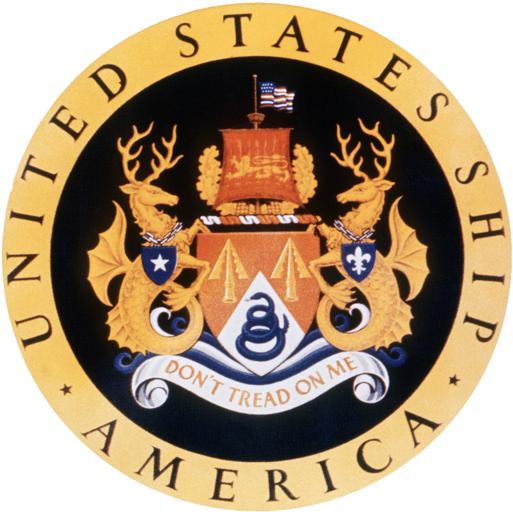 | Keywords: USS America (CV-66) insignia 1963.png en Coat of arms of the U S Navy aircraft carrier USS America CV-66 <br> Blazon<br> SHIELD Per chevron Gules and Argent in base a rattlesnake coiled to strike Azure and in chief two Pheons points up Or <br> CREST On a wreath Argent and Gules in front of a wreath of oak Or a ship ™s mast flying the flag as purported to have been flown over the Serapis after its capture by John Paul Jones above a full sail Gules charged with a lion passant guardant of the third <br> MOTTO On a scroll Argent doubled of the like the words DON ™T TREAD ON ME Gules The words DON ™T TREAD ON ME as the ship ™s motto best reflect the spirit and traditions contained within the name AMERICA <br> SUPPORTERS On either side in front of three waves by the sea Azure and Argent a sea stag Or having suspended from their necks by a chain of the second an escutcheon of the first that to Dexter charged with a mullet and that to sinister with a FLEUR-DE-LIS both of the second <br> <br> Symbolism<br> SHIELD <br> The role of the Continental Navy in the American Revolution and of John Paul Jones as an outstanding figure throughout that conflict is the basic theme of the design The two arrowheads or pheons as they are known in heraldry are symbolic of the welding of sea and Air Forces into a single mighty weapon the Aircraft Carrier <br> The white of the field on which the rattler is depicted is an allusion to the ships sent to our assistance under the Bourbon Flag of France while the coiled rattlesnake was a symbol in popular use on captains´ flags in the Continental Marine <br> The Crest showing an American flag A type reputed to have been flown by the captured Serapis while in the Dutch Harbor of the Texel flying above a British sail all in front of a golden oak wreath symbolizes the most glorious event of John Paul Jones Naval career The Battle of the Bonhomme Richard under his command with HMS Serapis <br> He defeated the Serapis in a desperate fight and as his own ship the Richard was mortally damaged Jones sailed the Serapis into the Texel in Holland <br> The two stags represented on John Paul Jones´ coat of arms have been adapted as sea stags and used as supporters attesting to his lifelong dedication and devotion to the naval service <br> The shields pendent from their necks testify to the honors bestowed upon Jones both by France a country he loved and honored and by the United States his adopted homeland 6433347 en United States Navy 1965 01 23 Coat Of Arms Authorized 1961 01 01 PD-USGov-Military-Navy USS America CV-66 United States Navy aircraft carrier emblems 066 Don't Tread on Me |