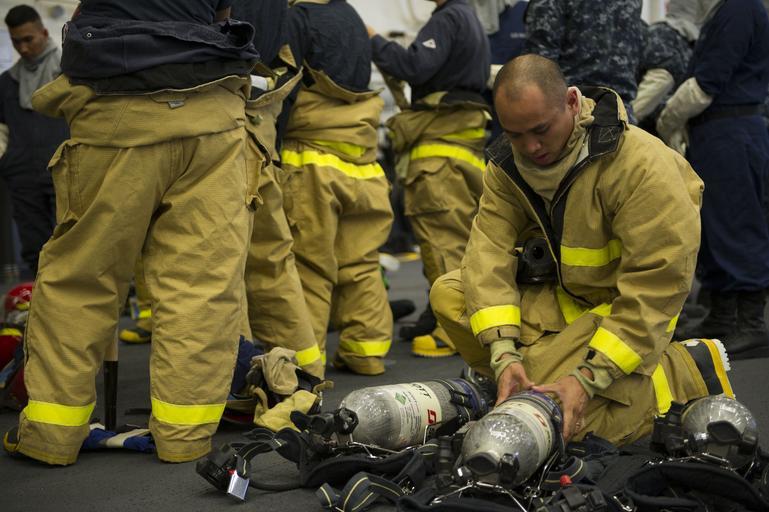 Keywords: USS America general quarters drill 141023-N-MZ309-056.jpg en Aviation Support Equipment Technician 1st Class Joseph Diaz assigned to amphibious assault ship USS America LHA 6 inspects a self-contained breathing apparatus during a general quarters drill aboard amphibious assault ship USS America LHA 6 The crew practices various drills to improve proficiency ensuring they are ready for any emergency America was recently commissioned during San Francisco Fleet Week 2014 and is the first ship of its class and the fourth to bear the name It replaces the Tarawa-class of amphibious assault ship as the next generation big-deck amphibious assault ship and is optimized for aviation and capable of supporting current and future aircraft such as the MV-22 Osprey and F-35B Joint Strike Fighter U S Navy photo by Mass Communication Specialist 2nd Class Ryan Riley/Released 2014-10-23 Ryan Riley https //www dvidshub net/image/1627649 141023-N-MZ309-056 2014-10-24 13 29 SAN DIEGO CA US PD-USGov-Military-Navy MV-22B Osprey USS America LHA-6 Images from DoD uploaded by Fæ |