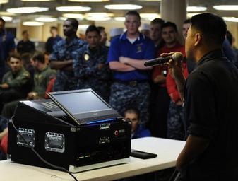 Keywords: USS America ice cream social 140802-N-CC789-326.jpg en Culinary Specialist 1st Class Marco Guevarra assigned to the future amphibious assault ship USS America LHA 6 sings a song during a karaoke and ice cream social night hosted by the first class petty officer mess America is currently traveling through the U S Southern Command and U S 4th Fleet area of responsibility on her maiden transit America visits the Americas America is the first ship of its class replacing the Tarawa-class of amphibious assault ships As the next generation big-deck amphibious assault ship America is optimized for aviation capable of supporting current and future aircraft such as the MV-22 Osprey and F-35B Joint Strike Fighter The ship is scheduled to be ceremoniously commissioned Oct 11 in San Francisco U S Navy photo by Mass Communication Specialist 1st Class Vladimir Ramos/Released 2014-08-02 Canadian Forces PO 1 VLADIMIR RAMOS https //www dvidshub net/image/1480487 140802-N-CC789-326 2014-08-03 22 59 ATLANTIC OCEAN PD-USGov-Military-Navy MV-22B Osprey USS America LHA-6 Images from DoD uploaded by Fæ |