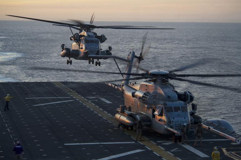 Keywords: USS America operations 141003-N-MD297-173.jpg en CH-53E Sea Stallions assigned to the Warhorses of Marine Heavy Helicopter Squadron HMH 465 land on the flight deck of future amphibious assault ship USS America LHA 6 during flight operations America is the first ship of its class replacing the Tarawa-class of amphibious assault ships As the next generation big-deck amphibious assault ship America is optimized for aviation capable of supporting current and future aircraft such as the MV-22 Osprey and F-35B Joint Strike Fighter The ship is scheduled to be ceremoniously commissioned Oct 11 in San Francisco U S Navy photo by Mass Communication Specialist 3rd Class Huey D Younger Jr /Released 2014-10-03 Petty Officer 3rd Class Huey Younger https //www dvidshub net/image/1597123 141003-N-MD297-173 2014-10-04 07 44 AT SEA PD-USGov-Military-Navy MV-22B Osprey USS America LHA-6 Images from DoD uploaded by Fæ |