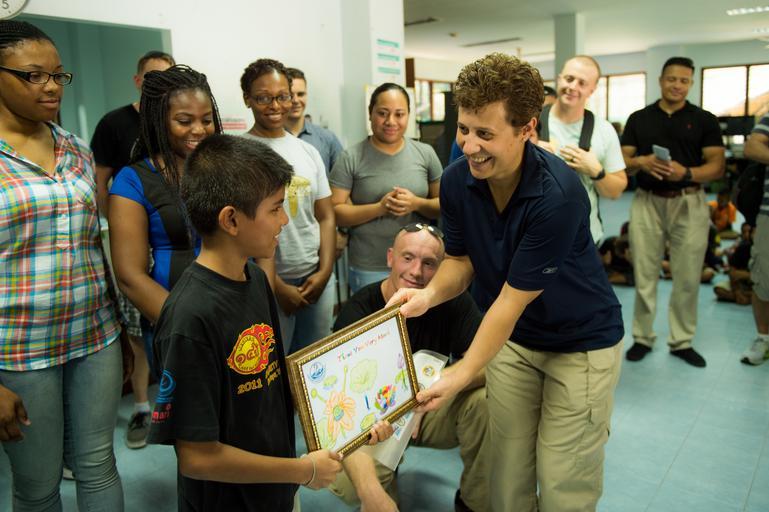 Keywords: USS Anchorage activities 150610-N-BD107-297.jpg en PATTAYA Thailand June 10 2015 Lt Cmdr Genevieve Clark chaplain aboard San Antonio-class amphibious transport dock ship USS Anchorage LPD 23 accepts a gift from a child during a community relations visit to the Fountain of Life center for underprivileged four to six year-olds The Essex Amphibious Ready Group is currently operating in the 7th fleet area of responsibility U S Navy photo by Mass Communication Specialist 2nd Class Liam Kennedy/Released 2015-06-10 Petty Officer 2nd Class Liam Kennedy https //www dvidshub net/image/1996974 150610-N-BD107-297 2015-06-13 00 01 PATTAYA TH PD-USGov-Military-Navy Pattaya USS Anchorage LPD-23 Images from DoD uploaded by Fæ |