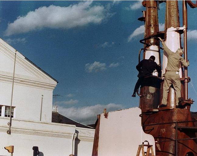 | Keywords: USS Balaos (SS-285) sail is painted pink.jpg Navy Memorial Museum Washington Navy Yard D C Naval Reservists painting the USS Balao SS-285 conning tower fairwater sail which was exibited in front of the museum Spring 1975 The color used was pink in honor of Balao's starring role as the pink submarine in the 1959 motion picture Operation Petticoat The pink paint lasted a few months until the humor wore thin after which standard Navy grey came back in vogue http //www history navy mil/photos/images/h83000/h83437k jpg Naval Historical Center cropped All information on this site is in the public domain and may be distributed or copied unless otherwise specified Use of appropriate byline/photo/image credits is requested PD-USGov-Military-Navy USS Balao SS-285 Submarine sails |