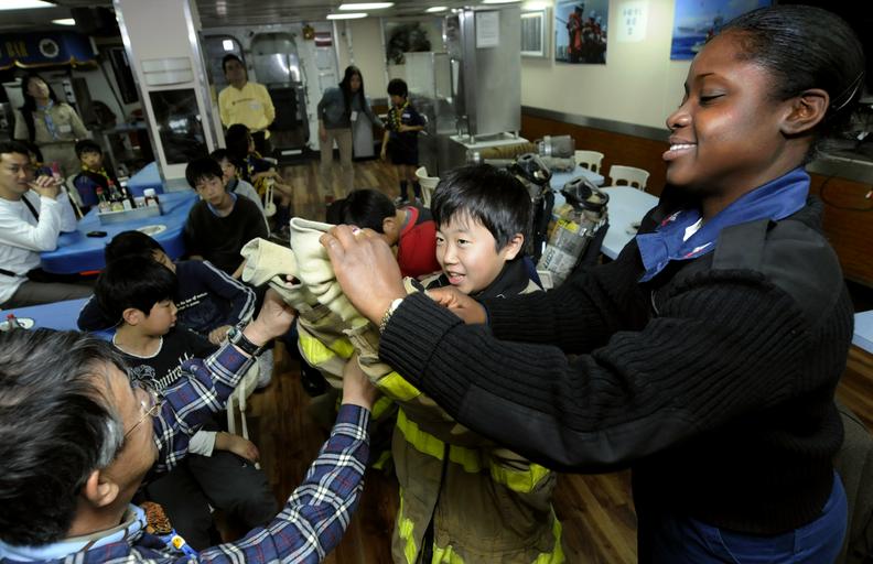 Keywords: USS Blue Ridge tour DVIDS275731.jpg en Petty Officer 1st Class Dale Marshall boatswain's mate a Sailor assigned to the U S 7th Fleet command ship USS Blue Ridge helps a Boy Scout put on a firefighting ensemble during a tour The visit included a tour of the ship hands-on firefighting demonstrations and traditional Navy knot tying <br>Unit Navy Media Content Services 2010-05-02 Petty Officer 3rd Class Daniel Viramontes https //www dvidshub net/image/275731/uss-blue-ridge-tour 100502-N-+++++-224 2010-05-04 20 52 HAKATA JP PD-USGov-Military-Navy USS Blue Ridge LCC-19 Images from DoD uploaded by Fæ |