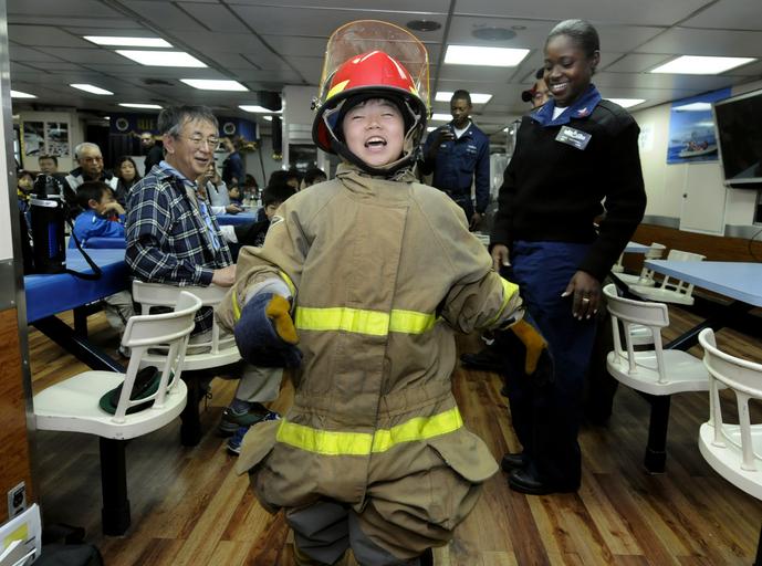 Keywords: USS Blue Ridge tour DVIDS275730.jpg en Petty Officer 1st Class Dale Marshall boatswain's mate a Sailor assigned to the U S 7th Fleet command ship USS Blue Ridge helps a Boy Scout put on a fire fighting ensemble during a tour The visit included a tour of the ship hands-on firefighting demonstrations and traditional Navy knot tying <br>Unit Navy Media Content Services 2010-05-02 Petty Officer 3rd Class Daniel Viramontes https //www dvidshub net/image/275730/uss-blue-ridge-tour 100502-N-+++++-225 2010-05-04 20 52 HAKATA JP PD-USGov-Military-Navy USS Blue Ridge LCC-19 Images from DoD uploaded by Fæ |