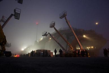 | Keywords: USS Bonhomme Richard Action DVIDS341988.jpg en Sailors assigned to the amphibious assault ship USS Bonhomme Richard LHD 6 walk through early morning fog to the ship and the messing and berthing barge Bonhomme Richard is preparing for a dry-dock maintenance availability period starting in December 2010-11-18 Joe Kane https //www dvidshub net/image/341988 101118-N-+++++-785 2010-11-21 01 51 SAN DIEGO CA US PD-USGov-Military-Navy USS Bonhomme Richard LHD-6 Images from DoD uploaded by Fæ Photographs by Joseph Kane |