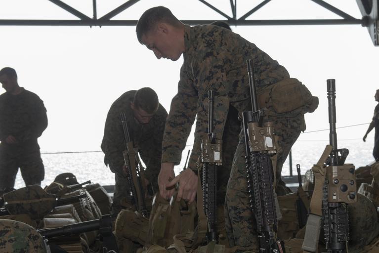 Keywords: USS Bonhomme Richard operations 150328-N-RU971-138.jpg en 150328-N-RU971-138 WATERS TO THE EAST OF THE KOREAN PENINSULA 31st Marine Expeditionary Unit Marines organize their gear in the hangar bay aboard the forward-deployed amphibious assault ship USS Bonhomme Richard in preparation to disembark for field training Bonhomme Richard is the lead ship of the Bonhomme Richard Amphibious Ready Group and along with the embarked 31st MEU is currently underway in the 7th Fleet Area of Operations 2015-03-28 March 28 2015 https //www dvidshub net/image/1842979 150328-N-RU971-138 2015-03-28 06 46 USS BONHOMME RICHARD WATERS EAST OF KOREA AT SEA PD-USGov-Military-Navy 31st Marine Expeditionary Unit USS Bonhomme Richard LHD-6 Images from DoD uploaded by FĂŚ |