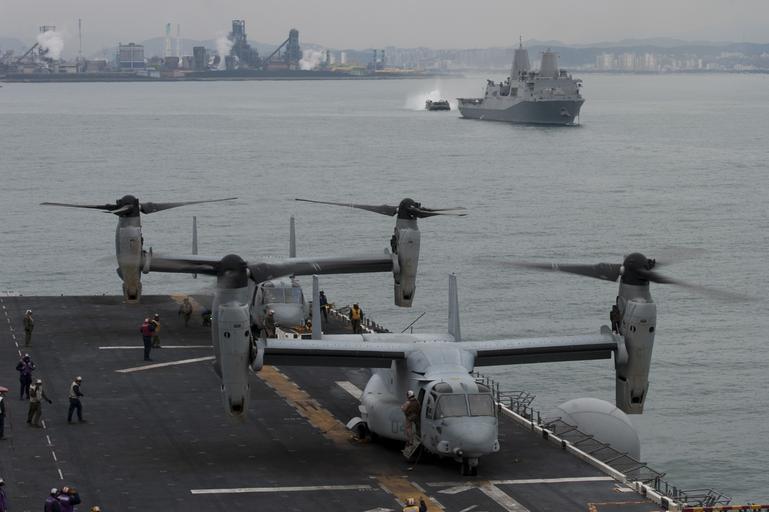 Keywords: USS Bonhomme Richard operations 150402-N-RU971-162.jpg en 150402-N-RU971-162 WATERS TO THE EAST OF THE KOREAN PENINSULA MV-22 Osprey assigned to Marine Medium Tiltrotor Squadron 262 prepare to take off from the flight deck of the forward-deployed amphibious assault ship USS Bonhomme Richard as a Landing Craft Air Cushion propels through the water towards the amphibious transport dock ship USS Green Bay Green Bay is a part of the Bonhomme Richard Amphibious Ready Group and along with the embarked 31st Marine Expeditionary Unit is currently underway in the 7th Fleet Area of Operations 2015-04-02 April 2 2015 https //www dvidshub net/image/1852396 150402-N-RU971-162 2015-04-02 07 11 USS BONHOMME RICHARD WATERS TO THE EAST OF THE KOREAN PENINSULA AT SEA PD-USGov-Military-Navy MV-22B Osprey 31st Marine Expeditionary Unit USS Bonhomme Richard LHD-6 USS Green Bay LPD-20 Images from DoD uploaded by FĂŚ |