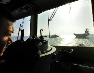 Keywords: USS Bunker Hill action DVIDS358696.jpg en Ensign Livy Coe shoots a bearing off the aircraft carrier USS Carl Vinson right aboard the guided-missile cruiser USS Bunker Hill during a transiting exercise with the Republic of Korea navy destroyers ROKS Dae Jo Yeong and ROKS Kwangyaeto Dae Wang Bunker Hill and Carrier Strike Group 1 are on a scheduled deployment to the U S 7th Fleet area of responsibility 2011-01-14 https //www dvidshub net/image/358696 110114-N-+++++-001 2011-01-18 21 02 USS BUNKER HILL AT SEA PD-USGov-Military-Navy USS Carl Vinson CVN-70 Images from DoD uploaded by Fæ |