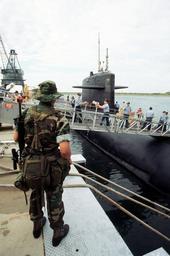 Keywords: outdoor A member of Marine Detachment Security Group 6, part of a Fleet Anti-terrorist Security Team (FAST), watches from the pier as the crew of the nuclear-powered strategic missile submarine USS CASIMIR PULASKI (SSBN 633) resupplies their vessel Exercise LANTCOOPEX 1-89. The Marine is armed with an M16A2 rifle equipped with a telescopic sight and blank firing attachment, 5/1/1989 Port Canaveral, Florida Camera Operator: PH1(Sw) J. Alan Elliott National Archives Series: Combined Military Service Digital Photographic Files, 1982 - 2007 Record Group 330: Records of the Office of the Secretary of Defense, 1921 - 2008 A member of Marine Detachment Security Group 6, part of a Fleet Anti-terrorist Security Team (FAST), watches from the pier as the crew of the nuclear-powered strategic missile submarine USS CASIMIR PULASKI (SSBN 633) resupplies their vessel Exercise LANTCOOPEX 1-89. The Marine is armed with an M16A2 rifle equipped with a telescopic sight and blank firing attachment, 5/1/1989 Port Canaveral, Florida Camera Operator: PH1(Sw) J. Alan Elliott National Archives Series: Combined Military Service Digital Photographic Files, 1982 - 2007 Record Group 330: Records of the Office of the Secretary of Defense, 1921 - 2008 |