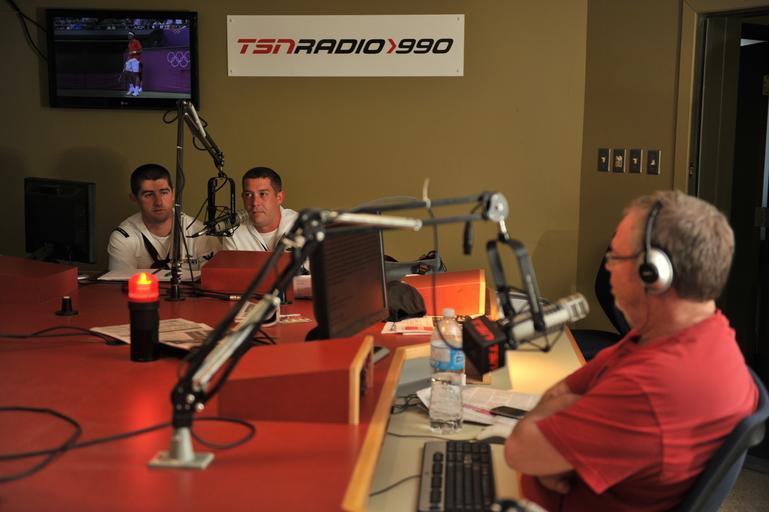 | Keywords: USS DeWert (FFG 45), USS Hurricane (PC 3) and HMCS Ville de Quebec (FFH 332) visit cities in America, Canada 120731-N-YZ751-366.jpg en Operations Specialist 3rd Class Zach Wood left and Electronics Technician 2nd Class John Cochran both from Oliver Hazard Perry-class frigate USS DeWert FFG 45 answer questions from Ted Bird on TSN Radio 990 Montreal about the ship's visit to the city DeWert Cyclone-class coastal patrol ship USS Hurricane PC 3 and Canadian Halifax-class frigate HMCS Ville de Quebec FFH 332 are visiting cities in America and Canada to commemorate the Bicentennial of the War of 1812 U S Navy photo by Mass Communication Specialist 2nd Class Tony D Curtis 2012-07-31 Canadian Forces CPO 2 Anthony Curtis https //www dvidshub net/image/639129 120731-N-YZ751-366 2012-08-03 23 03 MONTREAL CA PD-USGov-Military-Navy USS De Wert FFG-45 USS Hurricane PC-3 Images from DoD uploaded by Fæ |