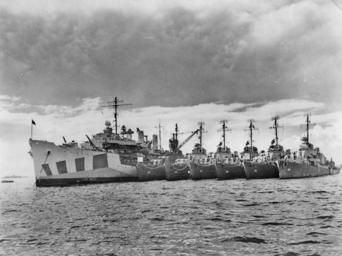 Keywords: USS Dixie w destroyers Leyte 1945.jpg The U S Navy destroyer tender USS Dixie AD-14 at San Pedro Bay Leyte island Philippines in April/May 1945 at anchor with six Allen M Sumner-class destroyers alongside The Dixie is painted in camouflage measure 32 The destroyers are l-r USS Compton DD-705 USS Ault DD-698 USS Charles S Sperry DD-697 USS English DD-696 USS John W Weeks DD-701 and USS Borie DD-704 Official U S Navy photo http //www navsource org/archives/09/03/09031421 jpg between 1945-04 1945-05 USN USS Dixie AD-14 USS English DD-696 USS Charles S Sperry DD-697 USS Ault DD-698 USS John W Weeks DD-701 USS Borie DD-704 USS Compton DD-705 Camouflage Measure 32 Philippines Campaign 1944 “45 PD-USGov-Military-Navy |