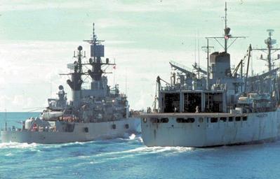 Keywords: USS Fox (DLG-33) and Sacramento (AOE-1) off Vietnam 1970.jpg The U S Navy guided missle cruiser USS Fox DLG-33 coming alongside the fast combat support ship USS Sacramento AOE-1 in the South China Sea in 1970 Note the Big Mother search and rescue Sikorsky HH-3A Sea King helicopter on Fox´ flight deck Official U S Navy photograph http //www navsource org/archives/09/59/09590157 jpg available on http //www navsource org/archives/04/1133/040133 htm Navsource org 1970 STGC Lee Noland USN aboard USS Bausell DD-845 PD-USGov-Military-Navy USS Fox CG-33 USS Sacramento AOE-1 HH-3A Sea King Vietnam War in 1970 |