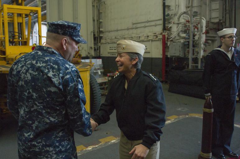 Keywords: USS George Washington 141203-N-GT589-015.jpg en Vice Adm Nanette M DeRenzi Judge Advocate General of the Navy center greets Rear Adm John Alexander commander of Battle Force U S 7th Fleet in the hangar bay of the Nimitz-class aircraft carrier USS George Washington during a visit to the ship George Washington and its embarked air wing Carrier Air Wing 5 provide a combat-ready force that protects and defends the collective maritime interests of the U S and its allies and partners in the Indo-Asia-Pacific region 2014-12-03 CVN 73 https //www dvidshub net/image/1685792 141203-N-GT589-015 2014-12-03 16 52 USS GEORGE WASHINGTON CVN 73 AT SEA PD-USGov-Military-Navy USS George Washington CVN-73 Images from DoD uploaded by Fæ John D Alexander Nanette M DeRenzi |