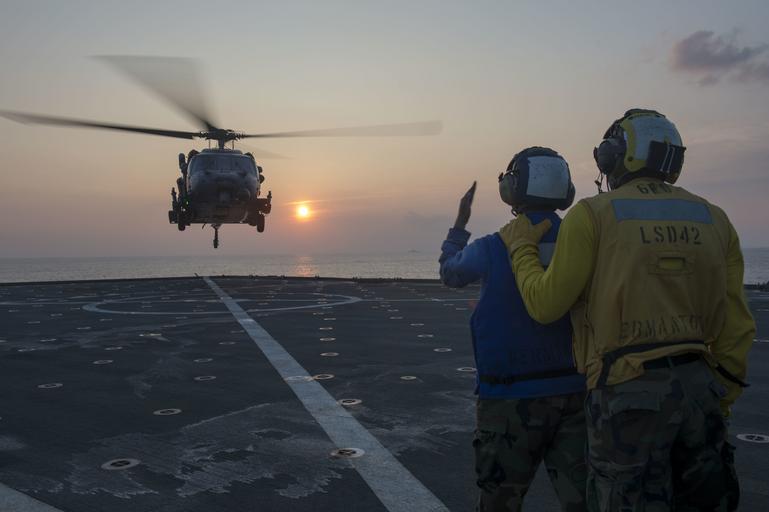 Keywords: USS Germantown 140909-N-UD469-334.jpg en Boatswain ™s Mate 3rd Class Robert Mclymont from Miramar Fla right and Culinary Specialist Seaman Nicole Little from Harrisburg Pa signal an Air Force HH-60 Pave Hawk assigned to the 33rd Rescue Squadron as it lands on the flight deck of the amphibious dock landing ship USS Germantown LSD 42 Germantown is part of the Peleliu Amphibious Ready Group PELARG 14 and is conducting joint forces exercises in the U S 7th Fleet area of responsibility U S Navy photo by Mass Communication Specialist 2nd Class Amanda R Gray/Released 2014-09-09 Petty Officer 2nd Class Amanda Gray https //www dvidshub net/image/1542158 140909-N-UD469-334 2014-09-10 12 00 PHILIPPINE SEA AT SEA PD-USGov-Military-Navy USS Germantown LSD-42 Images from DoD uploaded by Fæ |