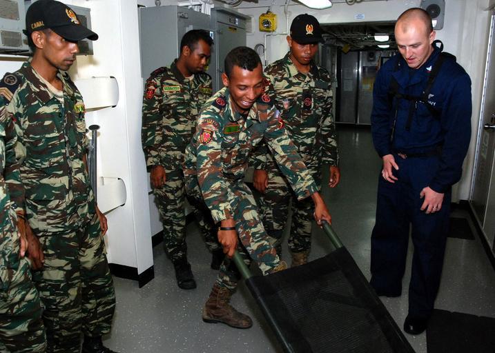 Keywords: USS Green Bay 121011-N-BB534-418.jpg en Seaman Armando Garcia a sailor with the Timor-Leste Defense Force F-FDTL assembles a stretcher during a tour of the medical department aboard amphibious transport dock ship USS Green Bay LPD 20 Green Bay is currently participating in Exercise Crocodilo 2012 a multilateral exercise that promotes partnership through community service and training with the F-FDTL U S Navy Photo by Mass Communication Specialist 1st Class SW/AW Elizabeth Merriam 2012-10-11 Petty Officer 2nd Class Elizabeth Merriam https //www dvidshub net/image/721944 121011-N-BB534-418 2012-10-14 09 00 BANDA SEA AT SEA PD-USGov-Military-Navy USS Green Bay LPD-20 Images from DoD uploaded by Fæ |