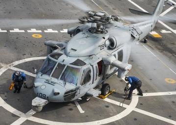 Keywords: USS Green Bay operations 150316-N-EI510-111.jpg en 150316-N-EI510-111 EAST CHINA SEA March 16 2015 Sailors remove chalks and chains form an MH-60S Seahawk Helicopter attached to the Island Knights of the Helicopter Sea Combat Squadron HMS aboard the forward deployed amphibious transport dock ship USS Green Bay LPD 20 Green Bay is part of the Bonhomme Richard Amphibious Ready Group ARG and along with the embarked 31st Marine Expeditionary Unit MEU is currently conducting a certification exercise U S Navy photo by Mass Communication Specialist 3rd Class Scott Barnes/Released 2015-03-16 Seaman Scott Barnes https //www dvidshub net/image/1819823 150316-N-EI510-111 2015-03-18 04 56 USS GREEN BAY EAST CHINA SEA AT SEA PD-USGov-Military-Navy MH-60S Seahawk 31st Marine Expeditionary Unit USS Green Bay LPD-20 Images from DoD uploaded by Fæ |
