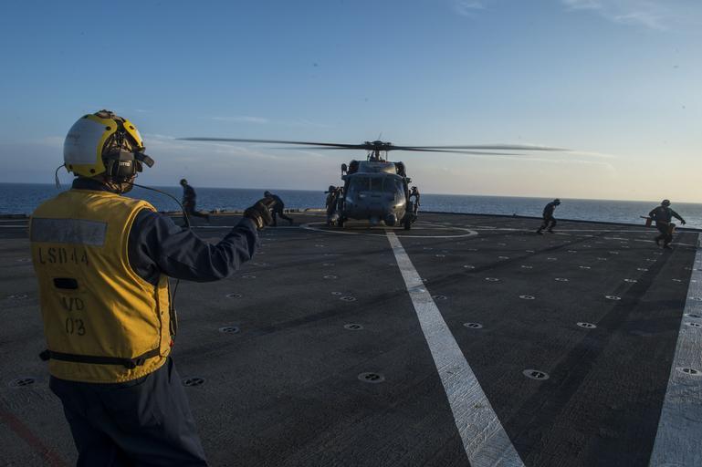 Keywords: USS Gunston Hall 140428-N-XJ695-394.jpg en U S Navy Boatswain's Mate 1st Class Ronnie Davis left directs the flight deck crew to remove chocks and chains from an Air Force HH-60G Pave Hawk helicopter as part of deck landing qualifications aboard the amphibious dock landing ship USS Gunston Hall in the Gulf of Aden April 28 2014 The Gunston Hall deployed as part of the Bataan Amphibious Ready Group with the embarked 22nd Marine Expeditionary Unit in support of maritime security operations and theater security cooperation efforts in the U S 5th Fleet area of responsibility 2014-04-28 LSD 44 https //www dvidshub net/image/1312975 140428-N-XJ695-394 2014-05-03 10 02 USS GUNSTON HALL LSD 44 AT SEA PD-USGov-Military-Navy USS Gunston Hall LSD-44 22nd Marine Expeditionary Unit Images from DoD uploaded by Fæ |