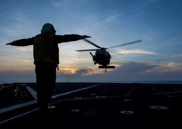 Keywords: USS Gunston Hall 140430-N-XJ695-032.jpg en U S Navy Boatswain's Mate 2nd Class Scott Hitter directs an Air Force HH-60G Pave Hawk helicopter during deck landing qualifications on the flight deck of the dock landing ship USS Gunston Hall in the Gulf of Aden April 30 2014 The Gunston Hall deployed as part of the Bataan Amphibious Ready Group with the embarked 22nd Marine Expeditionary Unit in support of maritime security operations and theater security cooperation efforts in the U S 5th Fleet area of responsibility 2014-04-30 LSD 44 https //www dvidshub net/image/1312999 140430-N-XJ695-032 2014-05-03 10 03 USS GUNSTON HALL LSD 44 AT SEA PD-USGov-Military-Navy USS Gunston Hall LSD-44 22nd Marine Expeditionary Unit Images from DoD uploaded by Fæ |