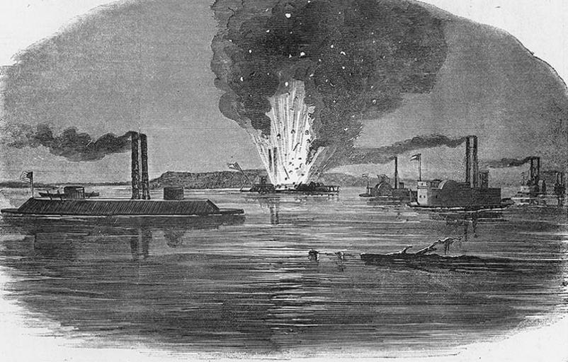 Keywords: USS Indianola blown up.jpg USS Indianola an American Civil War river gunboat blown up by confederates to avoid recapture after a dummy Union warship appears Original caption Line engraving after a sketch by Theodore R Davis published in Harper's Weekly 1863 depicting the 25 February 1863 operation in which a dummy ironclad left was floated down the Mississippi River by the U S Navy causing the Confederates to destroy the captured ironclad USS Indianola CSS Queen of the West is depicted at the right <br> Ship was sunk at the head of Palmyra island Then adjacent to the plantation of Jefferson Davis and New Carthage Shown on this map http //www geographicus com/P/AntiqueMap/MissRive2Col-USCS-1864 Current day view of present day Davis Island is shown http //members cox net/wplong1/images/Copy 20 2 20of 20USGS_C253BB0924BCAC30_1 jpg here Published in Harper's Weekly in 1863 http //www history navy mil/photos/sh-usn/usnsh-i/indanola htm 1863 Harper's Weekly line engraving after a sketch by Theodore R Davis 32 211944 -91 127102 PD-old PD-USGov Time and place is 25 February 1863 Louisiana Palmyra creek 1863 in Louisiana River gunboats of the American Civil War USS Queen of the West ship 1854 Louisiana in the American Civil War Explosions in art USS Indianola |