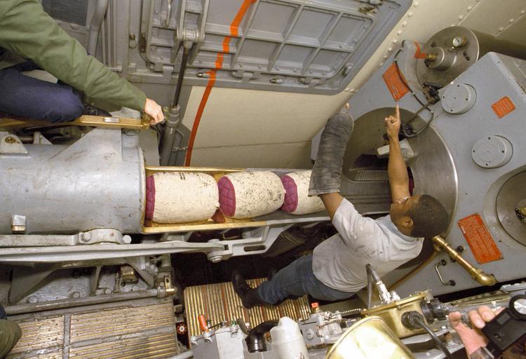 | Keywords: USS Iowa (BB-61) ramming powder bags.jpg en DN-SC-91-03644 - The gun captain of the center Mark 7 16-inch/50-caliber gun in the No 2 turret aboard the battleship USS IOWA BB-61 gives the signal to ram the powder bags on the spanning tray into the gun's chamber The crew is loading what will be the 1 000th round fired by the IOWAs 16-inch guns since the ship's recommissioning The panel opposite the gun captain with the red line is the door to the powder hoist from which the bags are delivered to the gun from the powder room at the base of the turret At left the rammerman operates the lever which uses hydraulics to ram the projectiles and powder bags into the gun's breech The rammerman must carefully operate the ram lever as an overram could jam the powder bags and/or projectile too far into the gun causing a dangerous situation On 19 April 1989 this same gun exploded and killed 47 crewmembers in the turret The explosion is theorized to have been caused by an overram of five bags of D-846 powder http //www defenseimagery mil/imagery html a search s DN-SC-91-03644 chk 40ffc rad 0 DoD Media image number DN-SC-91-03644 JPEG PHAN William Holck USN 1986-12-14 Image USS Iowa BB-61 placing powder bags jpg is moments earlier in the sequence of images showing the door to the powder hoist open PD-USN Aboard USS Iowa BB-61 Loading weapons 16 /50 caliber Mark 7 gun Ammunition Cold War and Modern artillery ammunition |
