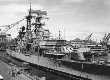 Keywords: USS Little Rock (CLG-4) at Boston Naval Shipyard 1971.jpg The U S Navy guided missile cruiser USS Little Rock CLG-4 undergoing an inclining experiment at the Boston Naval Shipyard Massachusetts USA 28 March 1971 Note her radars front to back Mk 34 gun director with Mk 13 radar; Mk 37 gun director with Mk 25 radar; SPS-37A and SPS-10 radar on the foremast and TACAN URN-3 on the mainmast; SPS-30 search radar atop the after superstructure Official U S Navy photograph http //www history navy mil/photos/images/h98000/h98982c htm NH 98982 1971-03-28 USN PD-USGov-Military-Navy 1971 in Boston USS Little Rock CLG-4 Ship radars of the United States Navy Boston Navy Yard AN/SPS-30 AN/SPS-43 |