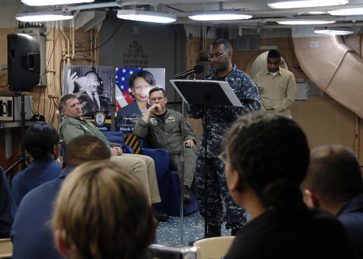 Keywords: USS Makin Island action DVIDS255804.jpg en Petty Officer 1st Class Marland Smith culinary specialist recites Martin Luther King Jr 's I Have a Dream speech during a Black History Month celebration aboard the amphibious assault ship USS Makin Island Makin Island the Navy's newest amphibious assault ship is underway off the coast of Southern California conducting Ship Self Defense System operational testing and evaluations 2010-02-22 U S Navy photo by Petty Officer 2nd Class Kellie Arakawa mass communication specialist https //www dvidshub net/image/255804 100222-N-+++++-001 2010-03-01 19 23 USS MAKIN ISLAND AT SEA PD-USGov-Military-Navy Black History Month Images from DoD uploaded by Fæ |