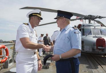 Keywords: USS Mason action 130805-N-PW661-012.jpg en U S Navy Cmdr Wilson Marks left the commanding officer of the guided missile destroyer USS Mason DDG 87 presents a command ball cap and challenge coin to Royal Dutch Military Police Brig Gen Andre Peperkoorn during a reception aboard the ship Aug 5 2013 in Amsterdam The Mason was on a port visit to the city while deployed as part of the Harry S Truman Carrier Strike Group in support of maritime security operations and theater security cooperation efforts in the U S 6th Fleet area of responsibility U S Navy photo by Mass Communication Specialist 2nd Class Rob Aylward/Released 2013-08-05 Petty Officer 3rd Class Rob Aylward https //www dvidshub net/image/1019915 130805-N-PW661-012 2013-09-17 05 45 AMSTERDAM NL PD-USGov-Military-Navy USS Mason DDG-87 Images from DoD uploaded by Fæ |