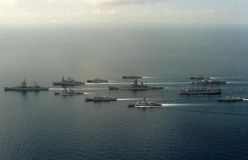 Keywords: USS New Jersey (BB-62) battle group with Australian ships 1986.JPEG An aerial view of the first U S Navy battleship battle group to deploy to the Western Pacific since the Korean War underway with Australian ships during a training exercise The ships are clockwise from left USS Long Beach CGN-9 USS Merrill DD-976 HMAS Swan DE 50 HMAS Stuart DE 48 HMAS Parramatta DE 46 USNS Passumpsic T-AO-107 USS Wabash AOR-5 HMAS Derwent DE 49 USS Kirk FF-1087 USS Thach FFG-43 HMAS Hobart D 39 and USS New Jersey BB-62 center http //www defenseimagery mil U S DefenseImagery photo VIRIN http //www defenseimagery mil/imagery html guid c26e46330bf9c6dff900992310576ac36e395a16 DN-SC-87-00354 1986-07-01 PH2 Orell USN PD-USGov-Military-Navy USS New Jersey BB-62 USS Long Beach CGN-9 USS Wabash AOR-5 USS Thach FFG-43 USS Merrill DD-976 USS Passumpsic AO-107 USS Kirk FF-1087 ship 1971 HMAS Hobart D 39 HMAS Derwent DE 49 River class destroyer escort of the Royal Australian Navy International groups of naval ships |
